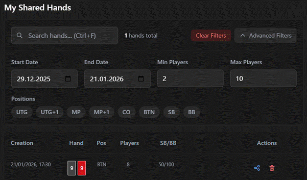 Share Hands: The replayer generates a link to the replayer. All sent hands are saved in a separate list, which can be sorted by date and position.