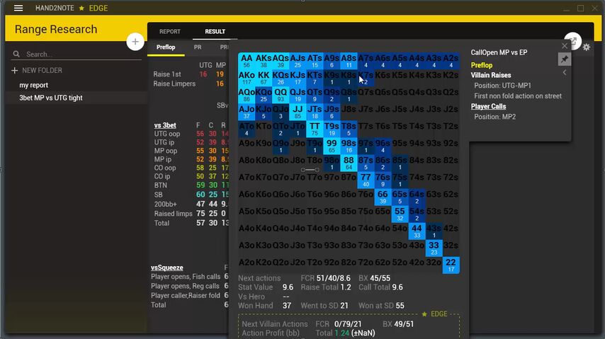Comprehensive Pre-Flop Charts. The Hand2Note charts display calling and raising ranges so that you can get a sense of players’ holdings.