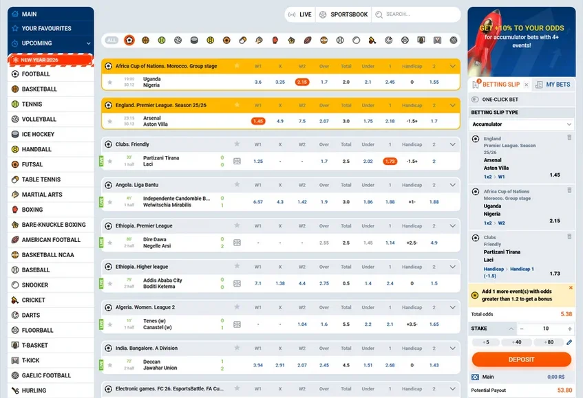 Mostbet targets the mass market, which is reflected in its sports coverage—40+ sports. The competition list is extensive and includes many leagues and tournaments, from top-tier events to niche competitions.