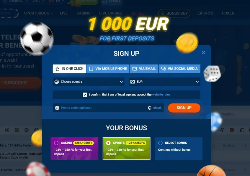 Regardless of the method, you must choose your country and account currency from dropdown menus. During registration, you can enter a promo code in the “Promo code” field. If you use GIPSYTEAM, the first-deposit offer is upgraded to a 250% bonus (up to €1,000) plus 250 free spins.