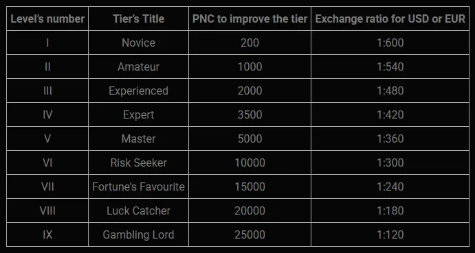 The loyalty system uses Pincoins (PNC) as an internal currency. You earn Pincoins for activities like playing games, making deposits, completing profile verification, and participating in site missions. Accumulated PNC both: