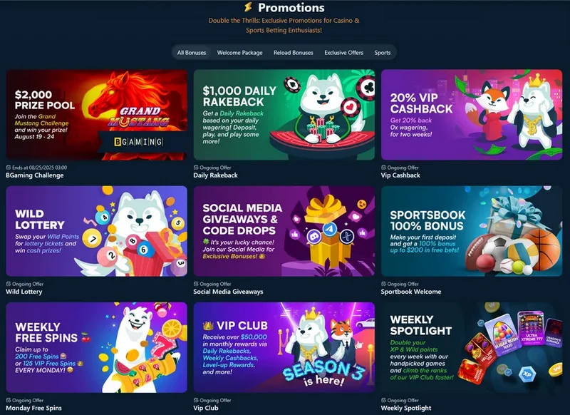 Wild.io does not currently offer a no deposit bonus, focusing instead on a tiered match across your first three deposits. While some competitors use no-deposit promotions to attract signups, Wild.io relies on consistent rewards through cashback, rakeback, and seasonal campaigns.