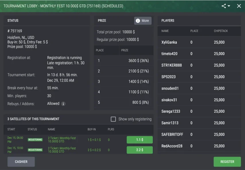 1Win Poker also hosts an exciting monthly flagship tournament that attracts many different players with its substantial prize pool. This event takes place on the last Saturday of every month at 6 PM Central European Time, offering a guaranteed prize pool of $10,000. The buy-in for this tournament is set at $55, which includes a $50 entry fee and a $5 additional fee.