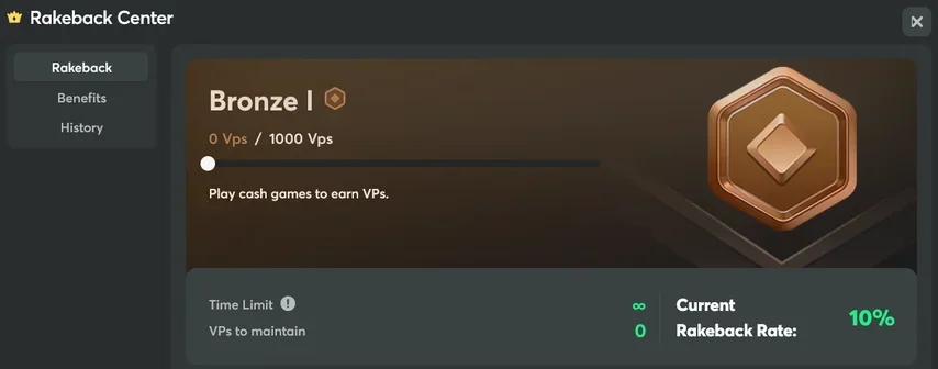 BCPoker offers up to 50% rakeback. Players can earn additional real money via a monthly bonus of up to $825. The amount depends on the player's status in the loyalty program. The VIP system includes six levels: Bronze, Silver, Gold, Platinum, Diamond, and Royal. Each consists of three ranks. To get the highest status in the loyalty program — Royal 3 — you need to generate $7,436 of rake per month. Rakeback is not credited to your account automatically. It is credited when the player reaches a new level. Players must transfer their rakeback to cash, otherwise it will expire within 30 days.
