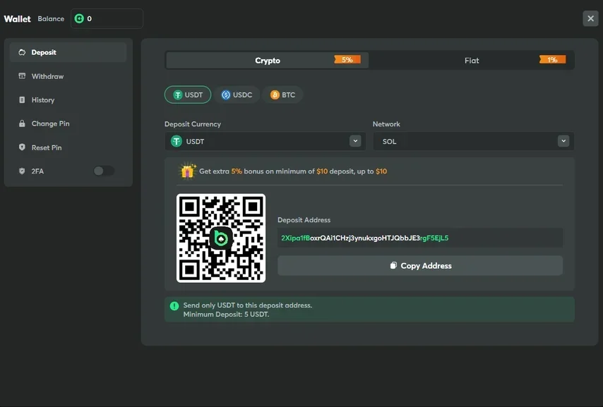 Here's how to deposit money to your balance using cryptocurrency: