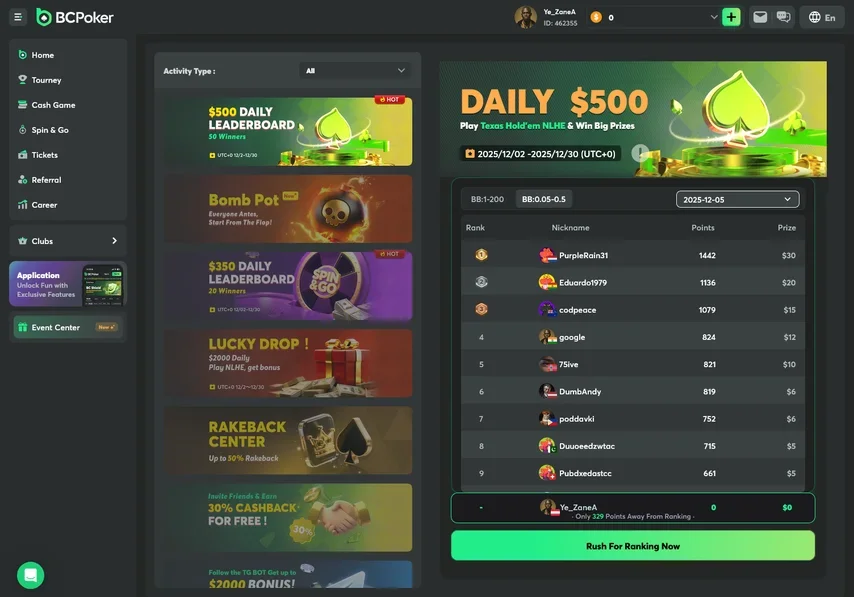 BCPoker also organizes rake races. Every day, $500 is raffled off in cash games and $350 in spins. The cash game leaderboards are divided into two divisions: