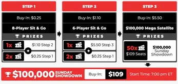 New players are also eligible for an 8-day package of free tournament tickets. These tickets are issued as Step Satellites that can be used to try to qualify for the $100,000 Sunday Showdown (Sunday, 7:00 pm ET). After meeting the daily rake requirement to unlock each ticket, you will find the Step Satellites in the Sit & Go section and work your way up to the Sunday Showdown Mega Satellite (12:00 pm ET), where the top 50 finishers win seats worth $109.