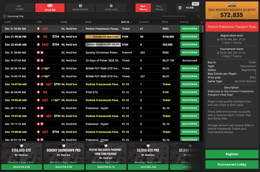 - Seasonal specials such as the $109 Halloween Main Event with a $250,000 guaranteed prize pool
