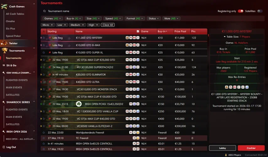- Wild Twister for €0.5. In this format, all participants automatically go all-in every hand. Instead of money, tickets for Twister spin and go with a value of €1 to €50 are awarded as prizes.