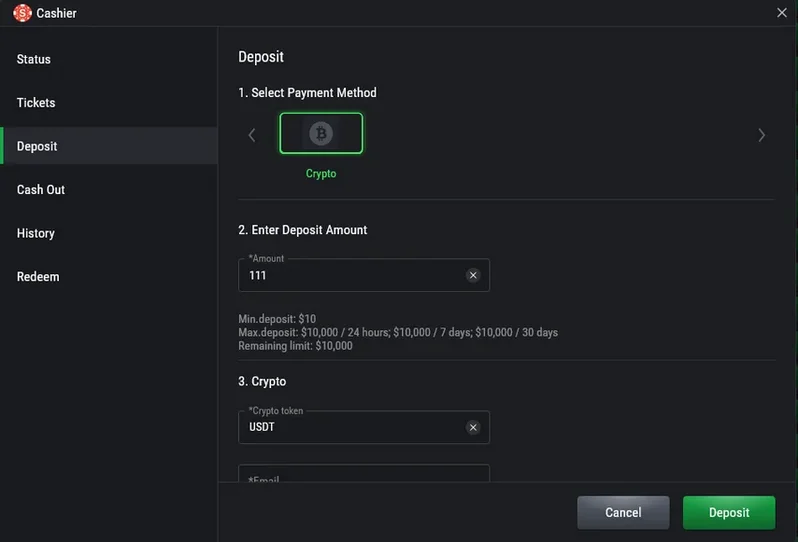 Withdrawals are also crypto-only. You can cash out only to the same wallet you used to deposit. To make a withdrawal, you must complete verification. Processing takes up to 24 hours.
