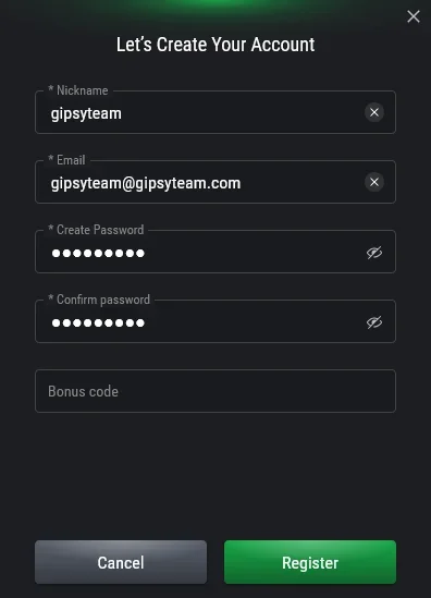- Fill in the fields: create a nickname and password, and enter your email address. Enter a promo code, if you have one. We recommend using GTEN to get acces to our future exclusive promotion.