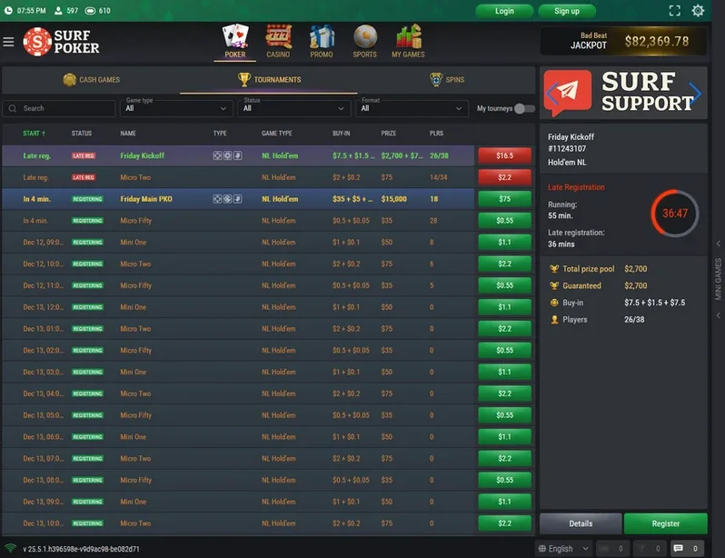 Surf Poker runs in a browser and uses software many players recognize from 1Win. It’s considered reliable. The room does not offer desktop or mobile apps. The software supports 20 languages. Navigation is built around three tabs: cash games, tournaments, and Spins.