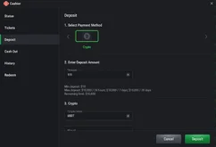 - Funds are credited instantly. The room does not charge a deposit fee, though the payment network will take a small transaction fee.