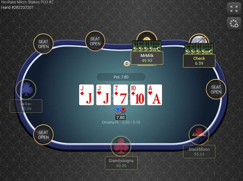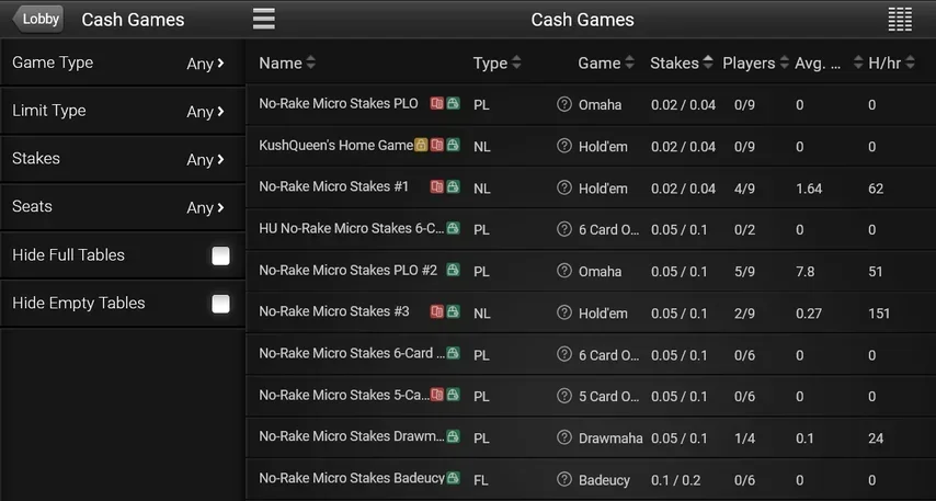 6-max and 9-max tables are available, there are also heads-up tables in the lobby. Blinds start at $0.01/0.02 and go as high as $5,000/10,000 (in chips).