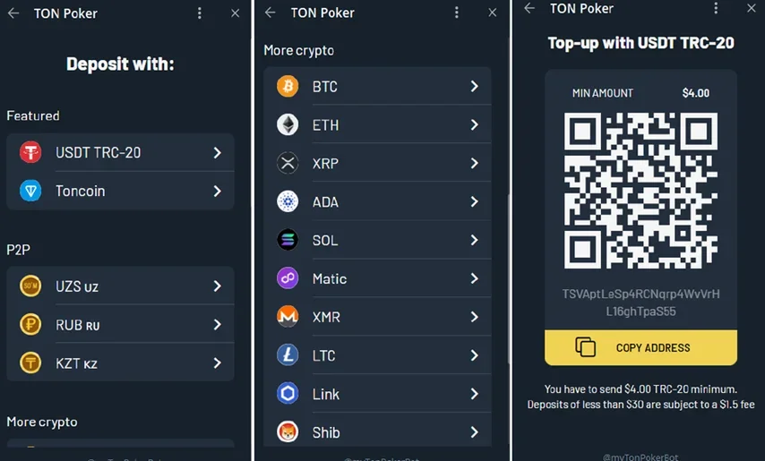The coins available for deposit may change in the future, so always refer to the TON Poker app for updated options. Each option might have a different minimum deposit, which is 0.30 for USDT, and slightly higher for other coins. Check the exchange rate before you make a deposit. You can also message the support team if you want to make a deposit using some other coin.