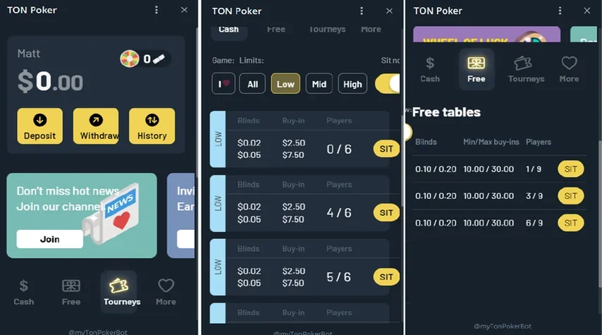 For a poker app using a messaging app’s platform, TON Poker runs surprisingly well. One click takes you through to the lobby, which is very easy to navigate. When you open up TON Poker through the Telegram link, you’ll see four navigational buttons: “Cash, Tasks, Tourneys, Bet, More”. These will get you to your games and things like the affiliate program.