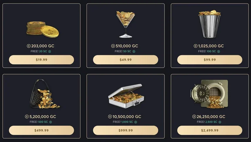 - Gold Coins (GC): These are play-money chips. You can buy Gold Coins with real money (they often come in large quantities) and use them to play in GC games for fun. However, GC have no direct monetary value – they cannot be exchanged back into cash. Gold Coins are essentially there for entertainment and practice. The site gives out some Gold Coins for free as well (e.g. daily login bonuses or social media giveaways).